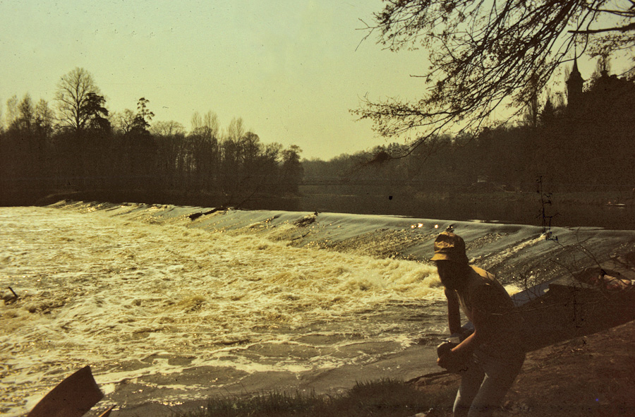 Schwieriges Umtragen am Grimmaer Wehr. Der Rücklauf ist gewaltig.