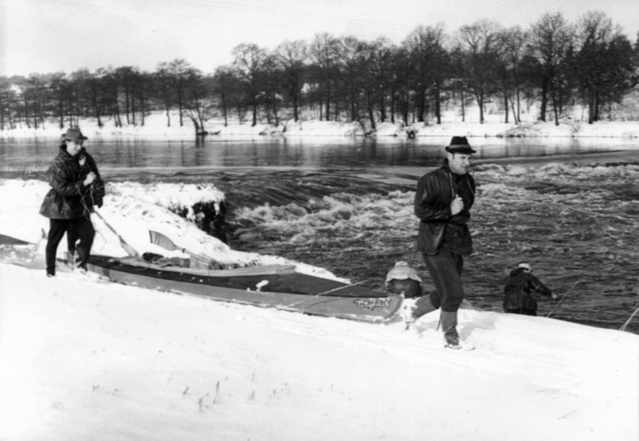 ZMF 1970 - am Ostersonntag liegt Schnee. Der erleichtert Christine und Bernd Kegel das Umtragen am Böhlener Wehr hinter Grimma.
