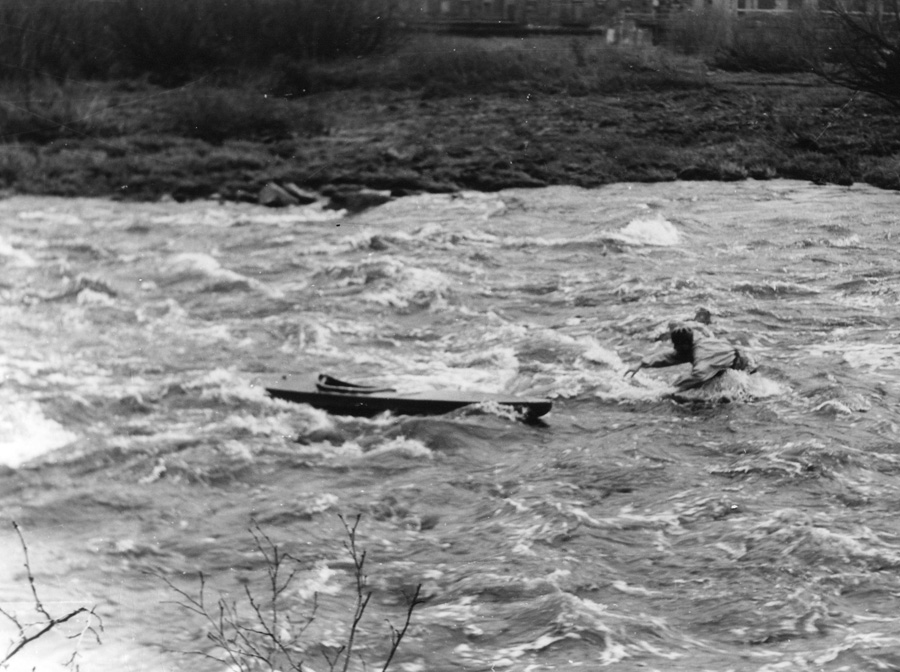 Ein gescheiterter Versuch, das Golzerner Wehr zu befahren, nun muss das Slalom-Faltboot wieder eingefangen werden.