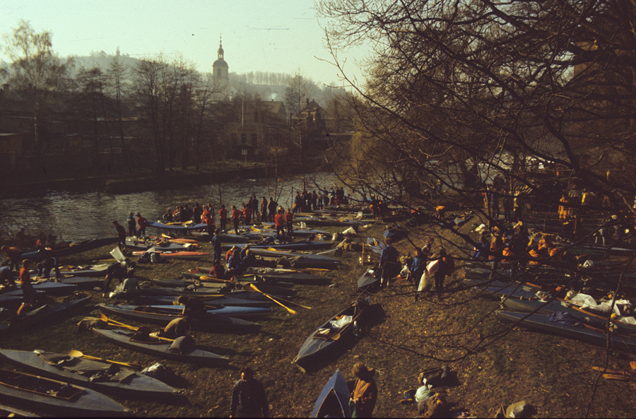 Am Karfreitag um 8:30 Uhr begann der Slalom in Waldheim. Noch dominieren die Faltboote.