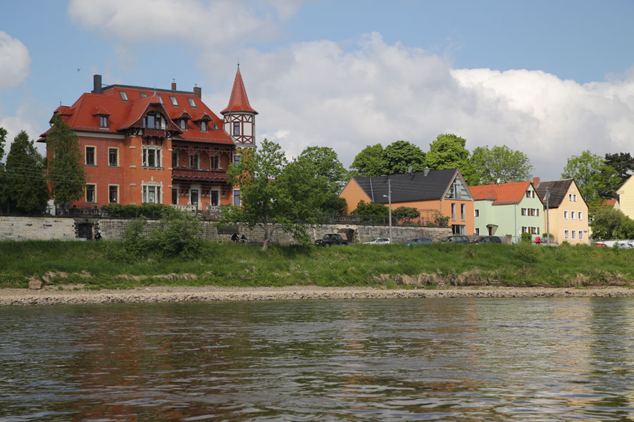 Elbe-Kilometer 46 in Dresden-Laubegast. Hier hatten die Organisatoren der Zschopau-Mulde-Fahrt einst ihr Bootshaus, heute steht neben der roten Villa ein neues Wohnhaus.