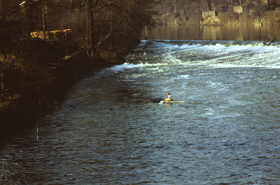 Kräftezehrende Traverse vor dem Waldheimer Mühlenwehr. Wer nicht dicht genug an das Wehr fuhr, drohte die Tore am andern Ufer zu verfehlen. Kam man dem Wehr zu nahe, riskierte man ein kühles Bad.