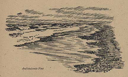Höher und höher stieg das Wasser, und zischend sandten die Brandungswellen schaumgekrönte Zungen auf den Strand, die bis an ihre Füße leckten. Allerlei sonderbare Dinge trieben da an und bildeten an der Flutgrenze einen Spülsaum.