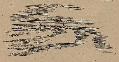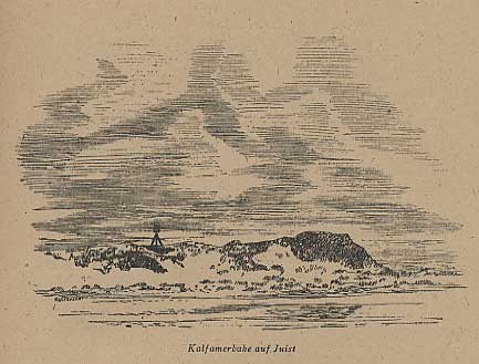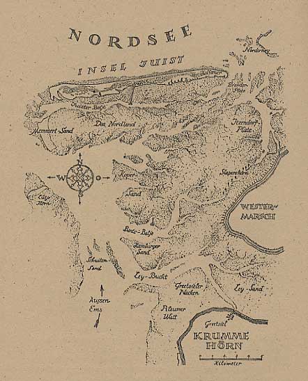 Nach Osten zu nahmen diese Büschel an Zahl ab, und überall zwischen ihnen glänzten weiße mürbe Muschelschalen. Schließlich wurde der Sand dunkler und feuchter und ging dann allmählich in das Watt über, das zu dem breiten Seegatt hinunterführte. Jenseits dieser Wattstrommündung lag die Insel Norderney. Hell leuchteten ihre weißen Hotels in der Sonne herüber.