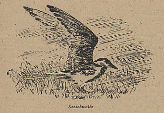 Der Vogelwart streifte stundenlang mit mir durch sein Reich und zeigte mir bald hier bald da eine Nestmulde zwischen den Strandhaferhalmen. Vor allem nisteten dort Seeschwalben mit den spitzen gabeligen Schwänzen, die oft in ganzen Wolken in der Luft einen ohrenbetäubenden, hellen, kreischenden Lärm vollführten und immer wieder auf uns niederstießen. Der Vogelwart machte dort Beringungsversuche und zählte jedes Jahr die Anzahl der verschiedenen Arten.