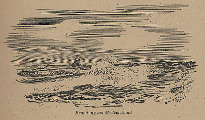 Vom Rücken einer Riesenwelle erkannte ich plötzlich etwas, was mich mit tiefem Entsetzen erfüllte: Wir trieben direkt auf den Medemsand zu, auf dem eine donnernde weißgischtende Brandung stand. Ich brüllte in das Sausen des Windes und in das Rauschen des Wasser: Umkehren! Aber mein Kamerad vernahm es nicht oder verstand es nicht.